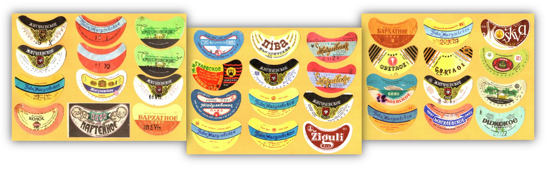 В Советском Союзе пиво продавалось в стеклянных тёмных (коричневых или тёмно-зеленых) евробутылках ёмкостью 0,5 литра, запечатанных крон-пробкой. Бутылки маркировались этикетками, показанными на фото в заголовке статьи. Продуманная форма полумесяца им придавалась для того, чтобы они без морщин и складок наклеивались на верхнюю коническую часть бутылки. Таким был пивной традиционный стиль.