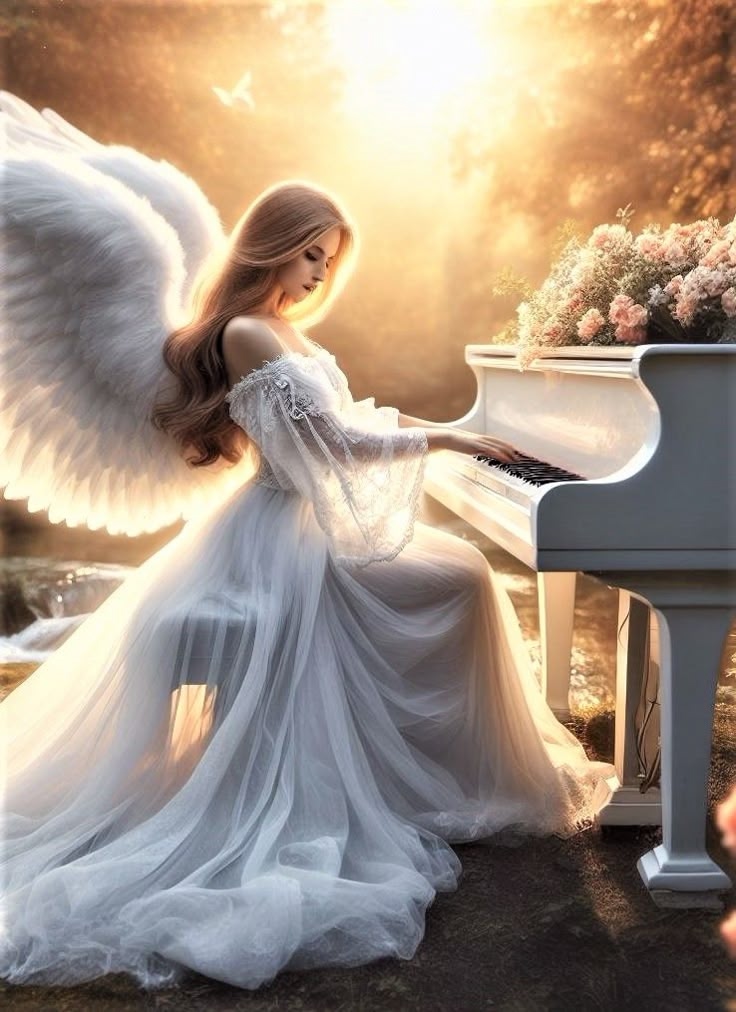 Это эхо воплотилось в образе прелестной девушки, ласково скользящей длинными пальцами по клавишам инструмента, словно дивный ангел с белоснежными крыльями. Её игра наполнила пространство совершенно чистой, незатронутой мелодией, полной радости бытия — счастья быть собой, свободы творчества и возвышенного полёта души, отозвавшись музыкой вечной нежности, которую нелегко выразить словами, но легко почувствовать в мягкой мелодии сердца.