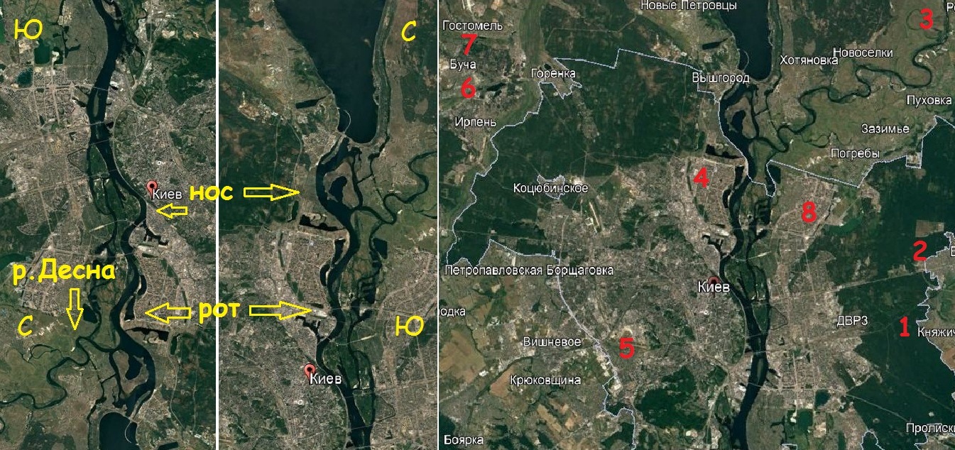 8. Троещина, вероятно является подтверждением "третьего лица" в русле Днепра, а именно Дёсенки. Лицо тоже просматривается. Таким образом, легенда о трёх братьях, основавших Киев, это легенда о трёх "водяных". Сестра "лебедь", возможно скрытый Киевским водохранилищем образ на Днепре. Можно предположить, что "лебедь" это образ созвездия Большая Медведица(Лада), так как других вариантов гидронимов, кроме этого, с этим образом нет. Обычно представляет не женское лицо, а "коробчатое русло" или прямой поворот", похожий на форму созвездия.
