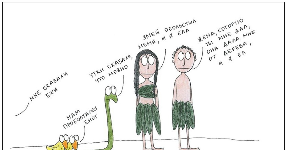 — Я? Ел? – голова Адама высунулась из кустов — Да это и едой назвать нельзя. Жена, которую мне ты сотворил, принесла на пробу и всё. Я вообще не при делах!