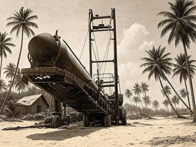 В джунглях замаскированы установки с баллистическими ракетами. Советские солдаты в тропической форме работают под палящим солнцем. Форма выцветшая, спины мокрые от пота. Худые, загорелые до черна. Рядом палатки для личного состава.