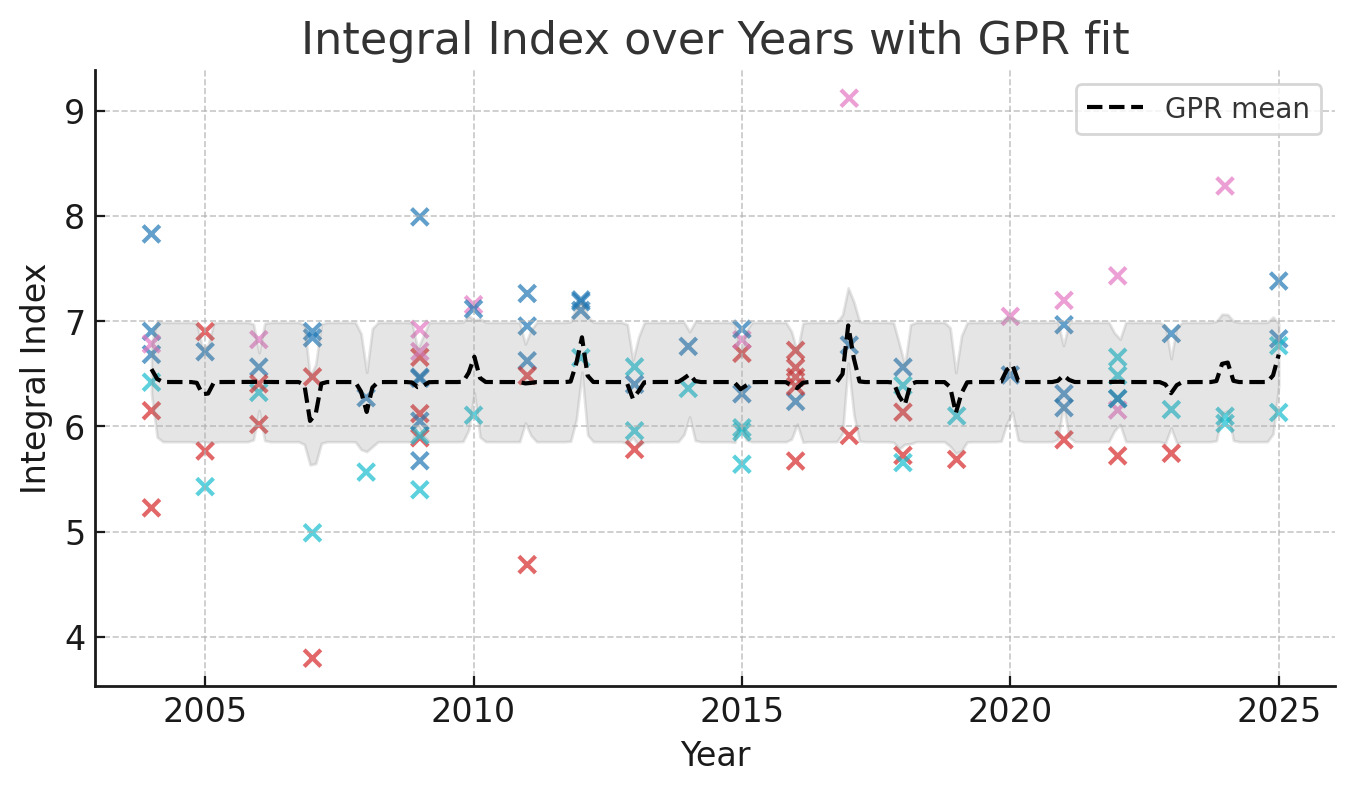 Для грубой количественной проверки тренда была применена линейная регрессия индекса по годам. Коэффициент наклона ; +0.1613 балла в год; это указывает на положительную долгосрочную динамику, однако отметим, что тренд нелинейный, а отдельные выбросы (например, провал в коммерческом проекте 2007) требуют аккуратной интерпретации.