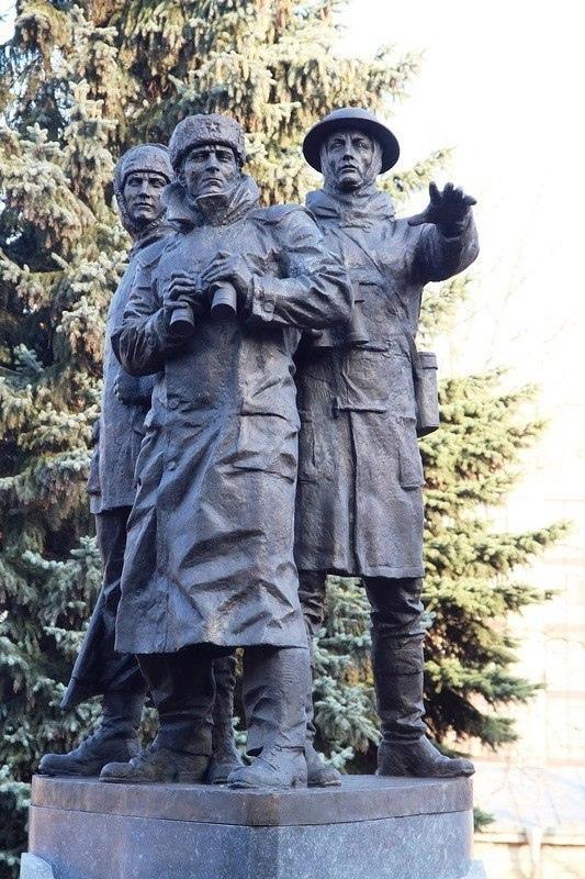 Скульптурная композиция состоит из трех фигур - советский моряк, англичанин и американец.
