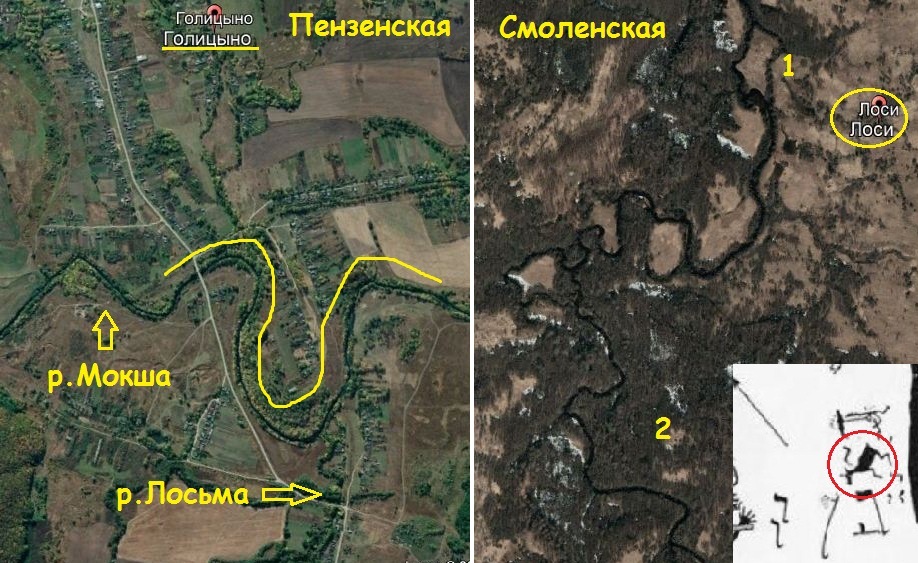 Как видно на фото, название деревень Лось, Лоси, расположенных на реках, также имеют этот образ, когда река своим руслом "рисует" лося, только уже не в "фас", а в "профиль", то есть вариант "расположения" образа на карте может быть разным.