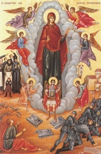 Сентябрь 1943 года. Итальянцы, которые вошли в Грецию, отступают. Жители Беотийского посёлка Орхоменос пришли к железнодорожной станции городка Ливадия и стали требовать у итальянского поста сдать оружие, угрожая в противном случае партизанами. Итальянцы отказались сдаться и известили об этом немцев, которые, недолго думая, решили сжечь посёлок Орхоменос дотла и наказать его жителей. Вечером 9 сентября в Орхоменос вошёл целый полк карателей и захватил в плен шестьсот человек. Часть немцев осталась в городке, тогда как остальные стали продвигаться к Дионису, где прятались партизаны. Недалеко от посёлка Орхоменос находится самая древняя во всей Беотии церковь, датируемая 874 годом и освящённая в честь Успения Пресвятой Богородицы - храм Скрипского монастыря. Была полночь. Колонна немцев находилась в пятистах метрах от храма, когда внезапно прямо посреди дороги остановился один из танков. Перед собой немцы неожиданно увидели Величественную Женщину с Поднятой Вверх Рукой, Преграждавшую им путь. Второй танк попытался было обойти первый, но съехал в кювет, а третий заглох на одном из огородов, через который пытался пройти. Наступил рассвет 10 сентября. Немецкий военачальник Хоффман потребовал у жителей трактор, чтобы вытащить танки. Последовало нечто необычное: тяжёлые машины были перетащены трактором как пустые спичечные коробки. - Чудо, чудо! - воскликнул немецкий военачальник и попросил местных жителей отвести его в церковь. В стоявшей в иконостасе иконе Божией Матери немец узнал преграждавшую движение колонны Женщину. Он упал на колени и воскликнул: "Эта Женщина спасла вас! Чтите Её и прославляйте!" Орхоменос был спасён. Хоффман отдал приказ освободить шестьсот обречённых на смерть пленных и дал слово, что до самого окончания войны с городом ничего не случится. Жители возблагодарили и прославили Заступницу Богородицу за своё спасение. Солнце начало заходить. Танки уходили с опущенными вниз пушками, будучи побеждёнными Взбранной Воеводой Орхоменоса. С тех пор 10 сентября стало праздничным днём. Почти каждый год, до самой своей смерти, Хоффман приезжал на этот праздник. Ещё он пожертвовал Богородице огромную свечу и дал деньги на написание первой иконы с изображением чуда.