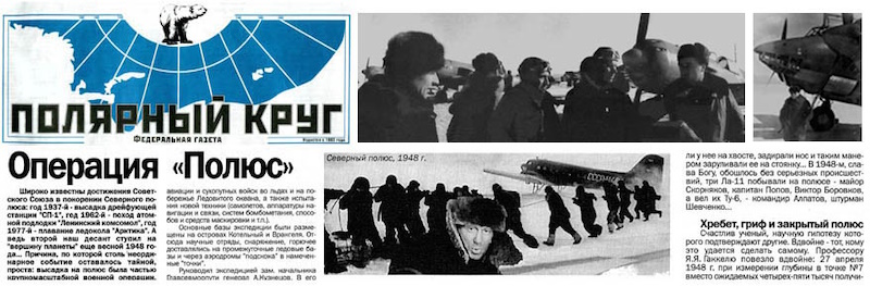 Широко известны достижения Советского Союза в покорении Северного полюса: год 1937-й - высадка дрейфующей станции "СП-1", год 1962-й - поход атомной подлодки "Ленинский комсомол", год 1977-й - плавание ледокола "Арктика". А ведь второй наш десант ступил на "вершину планеты" еще весной 1948 года. Причина, по которой столь неординарное событие оставалось неизвестным, проста: высадка на полюс была частью крупномасштабной военной операции, проведённой на материке, островах и дрейфующих льдах в гигантском треугольнике "Амдерма - Чукотка - полюс". Именно в те годы наши новейшие боевые машины - тяжелые бомбардировщики Ту-4 и истребители Ла-11 достигли полюса.