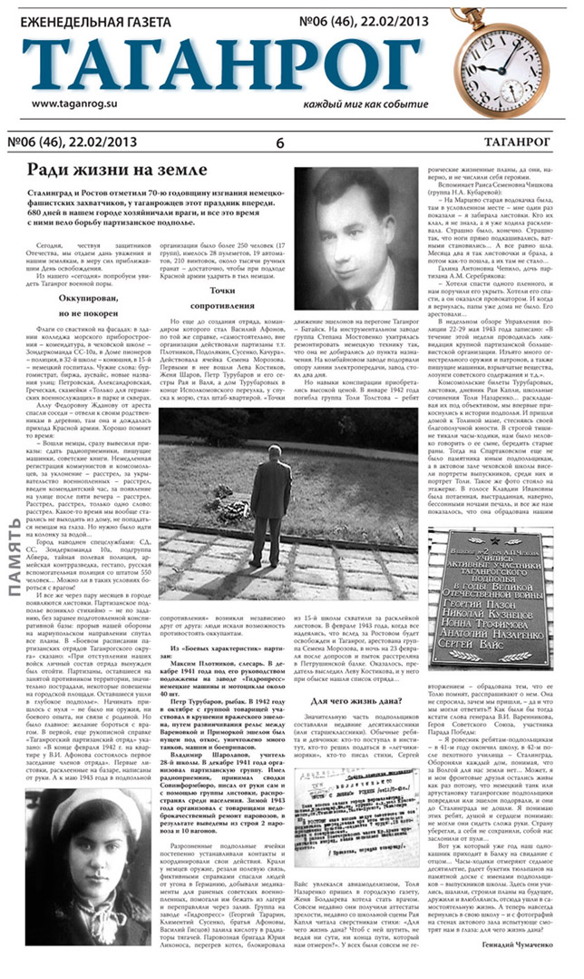 Опубликовано: газета «ТАГАНРОГ» 22.02.2013