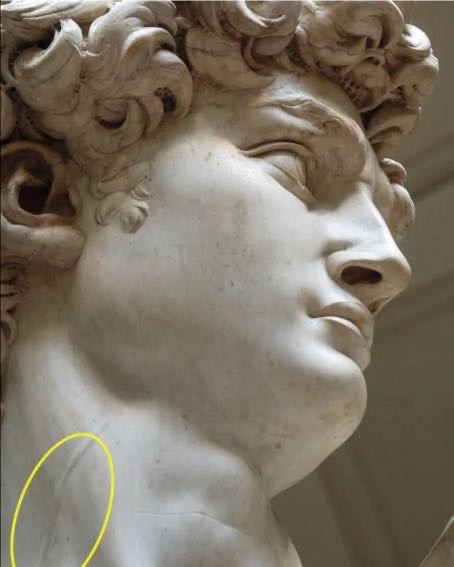 Видимая яремная вена на статуе точно передает состояние волнения библейского героя перед столкновением с филистимским великаном Голиафом.