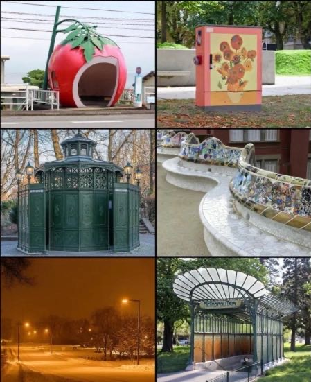 Один из этих способов лучше всего можно описать как причудливость, как эти автобусные остановки в форме фруктов и игривые скамейки.