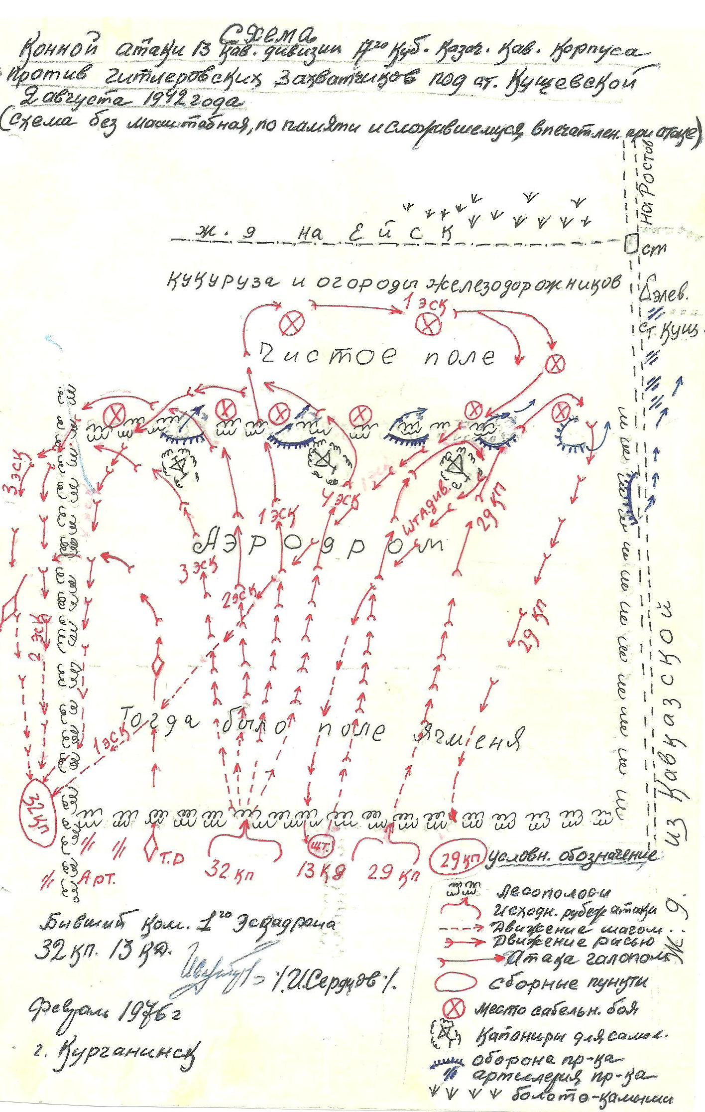 Для начала я ознакомился со всеми мне доступными материалами о боевом пути 17-го кавалерийского корпуса, ставшего после оборонительных боёв в августе 1942 года 4-м гвардейским казачьим кавалерийским корпусом. Затем я обратился к документам, хранившимся в Кущёвском районном историческом музее, предоставленными мне директором музея Шаповаловой Л.П. - схемой проведения конной атаки 3 августа 1942 года, составленную участником того боя командиром 1-го эскадрона 32-го Курганинского кавалерийского полка старшим лейтенантом Сердцовым И.И., а также его воспоминаниями о тех событиях. Некоторые материалы я получил от методиста музея станицы Шкуринской Анпилоговой Л.М.