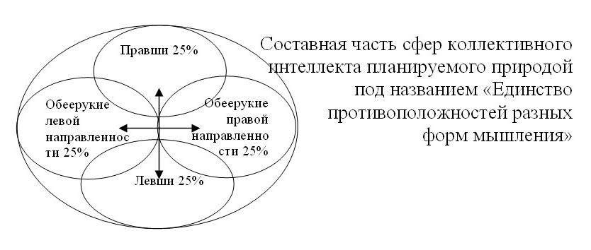 • Природа создала четыре равных формы мышления: Автор утверждает, что природа заложила четыре основные формы рукости и соответствующих им форм мышления, каждая из которых составляет 25% населения: