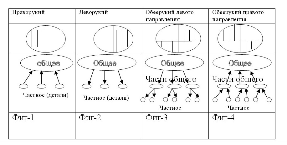(ниже показана Схема активации правого и левого полушарий и (четырёх) различных зон мозга при разных форм мышления - разных типах когнитивной деятельности)