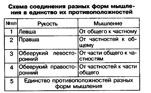 Мышление обеерукого левого направления, воспринимающего задачу от середины к частностям и мышление обеерукого правого направления от частностей к середине общего, - в тесты и диагностику для праворуких не помещаются.