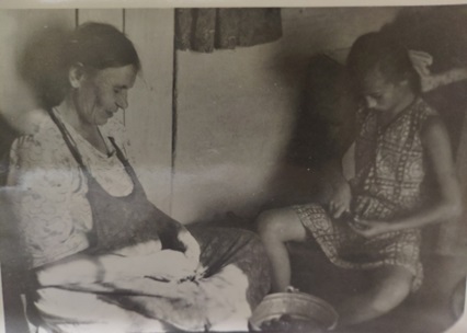 Это совсем не то варенье из садовой клубники, а уваренное до карамельного цвета и вкуса варенье из полевой клубники, редкий и изумительный деликатес. На старой не очень качественной фотографии мы с бабой чистим клубнику, год 1966-67. Почистить два ведра мелкой клубники – та еще работка. Но оно того стоило!