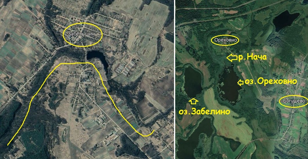 Другой пример, с похожим названием Забелино, есть в Витебской области, как видно на фото. Это озеро Забелино и Ореховно. Забелино аналогично названию Забелышин. В этом случае форма озёра на карте, в виде условной "неполной Луны", либо "серповидная форма берега" дали основание для названия. Река Нача(Ноча, то есть "ночная") подтверждают "лунную" основу в названиях этого места. Есть похожее "лунное" название реки Туношна http://proza.ru/2025/05/04/1673. Казалось бы, не относящееся к Луне название озера и деревни Ореховно, выбивается из этого ряда, но это не так. Орехо-в-но буквально "озеро, но не орех". Название имеет некое простое "шифрование". Часть слова "орехо-" современное "орех", буква "в" сокращённый слог "ва"(вода, русло, в этом случае "озеро"), слог "но" обозначает "неполное отрицание", как и в современном варианте. Таким образом, Ореховно буквально "не орех". Оба озера на карте, это образы Луны в "движении по небу": Забелино- первое положение, Ореховно- второе положение. Похожесть того, как двигается Луна ночью по небу. Такой же символизм двух озёр есть в Лихославле http://proza.ru/2025/04/02/1695, Льгове http://proza.ru/2025/06/30/254. Деревня Богушево или "богуша на воде", также связано с озёрами, как движение Луны(богуши) по небу.