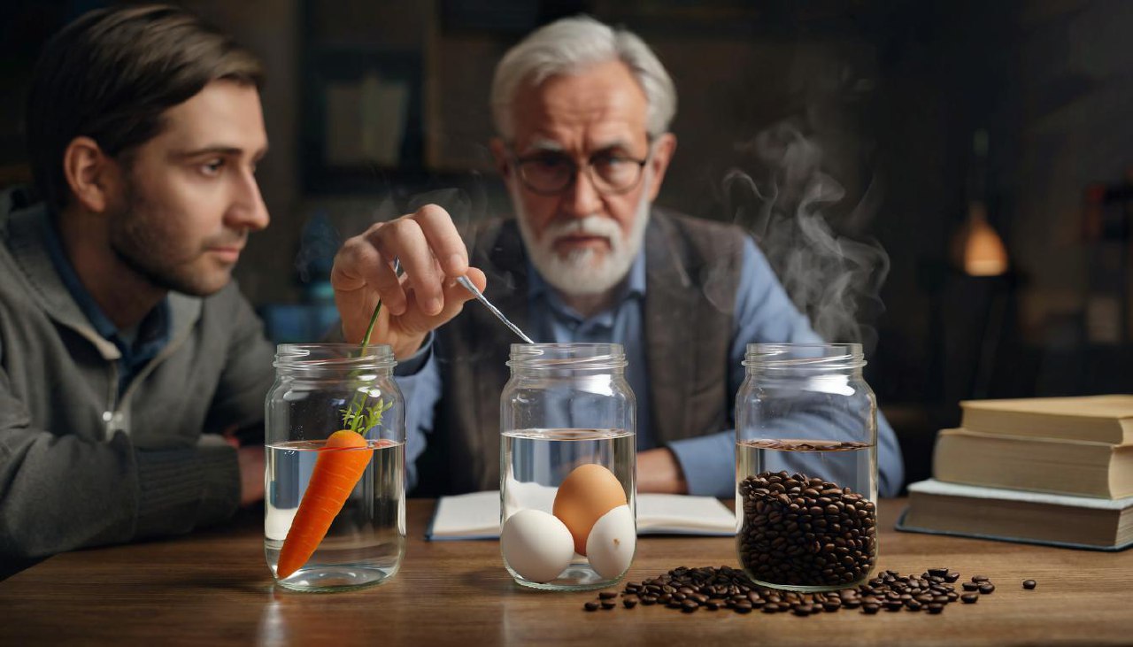 Учитель вместо ответа поставил на огонь три одинаковых емкости с водой. В одну емкость бросил морковь, в другую — положил яйцо, а в третью — насыпал зёрна кофе. Через некоторое время он вынул из воды морковь и яйцо и налил в чашку кофе из третьей емкости.