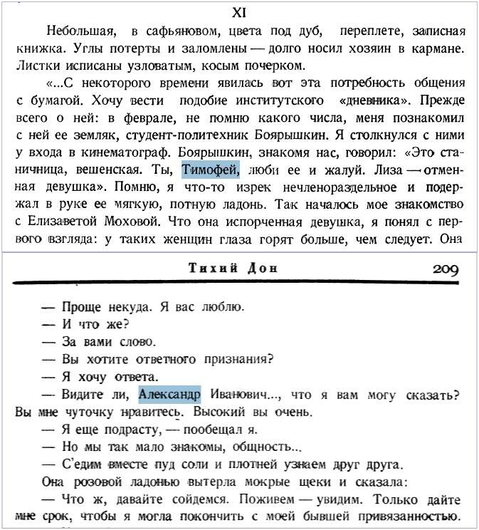 Итак, целых 20 лет в тексте романа погибший студент–казак (хозяин записной книжки) носил два имени — Тимофей и Александр. Мной сделана склейка скриншотов страниц журнала «Октябрь» (№ 3, 1928 г., стр. 206 и 209), где хорошо видна чужеродность «Тихого Дона» по отношению к Шолохову — налицо незнание текста романа титульным автором (см. картинку). Это наглядный пример того, что Шолохов переписывал с чужой рукописи механически, даже не запоминая предыдущий текст, и при этом допускал ошибки в прочтении написанного Крюковым.