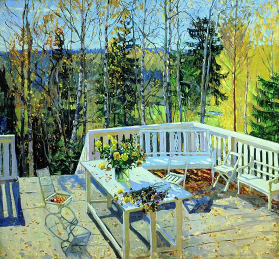 И вот уже у ворот нетерпеливо сигналит машина и пора ехать в город, оставляя белую дачу и осиротевшую террасу. Нет даже времени сложить последний осенний букет. Так и остался он на столе в ожидании зимы.