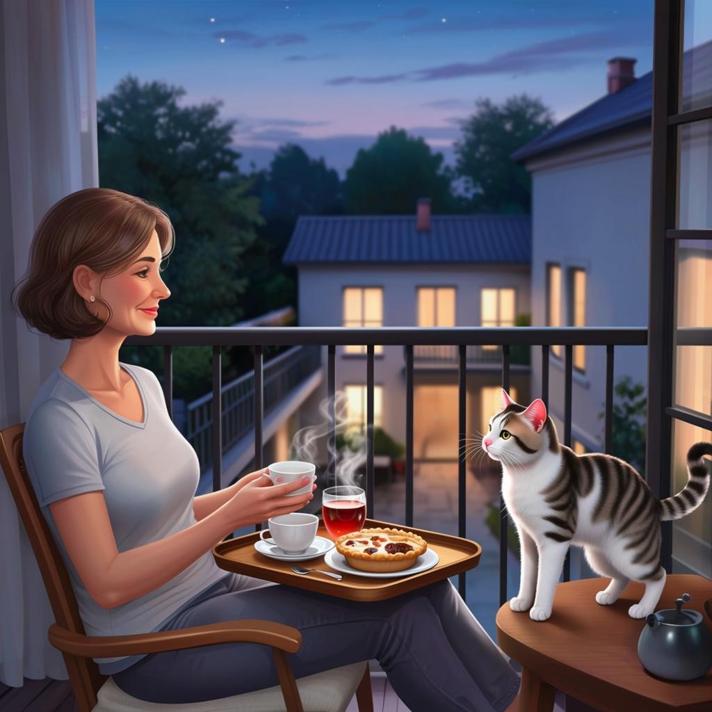 Вечером взять новый поднос с дымящимся чаем, блюдцем с пирогом и сесть на балконе. Муся обязательно запрыгнет на колени, осторожно издали понюхает чай, поближе поднесёт свой розовый нос к блюдцу, смешно втянет несколько раз аромат. "Нет, мои курочка и рыбка вкуснее, но у тебя тоже запах ничего, приятный, хозяйка". Внизу шум, смех, молодёжная музыка из автомобилей во дворе, крики детворы. Повезёт с погодой, ещё и звёзды увидим.