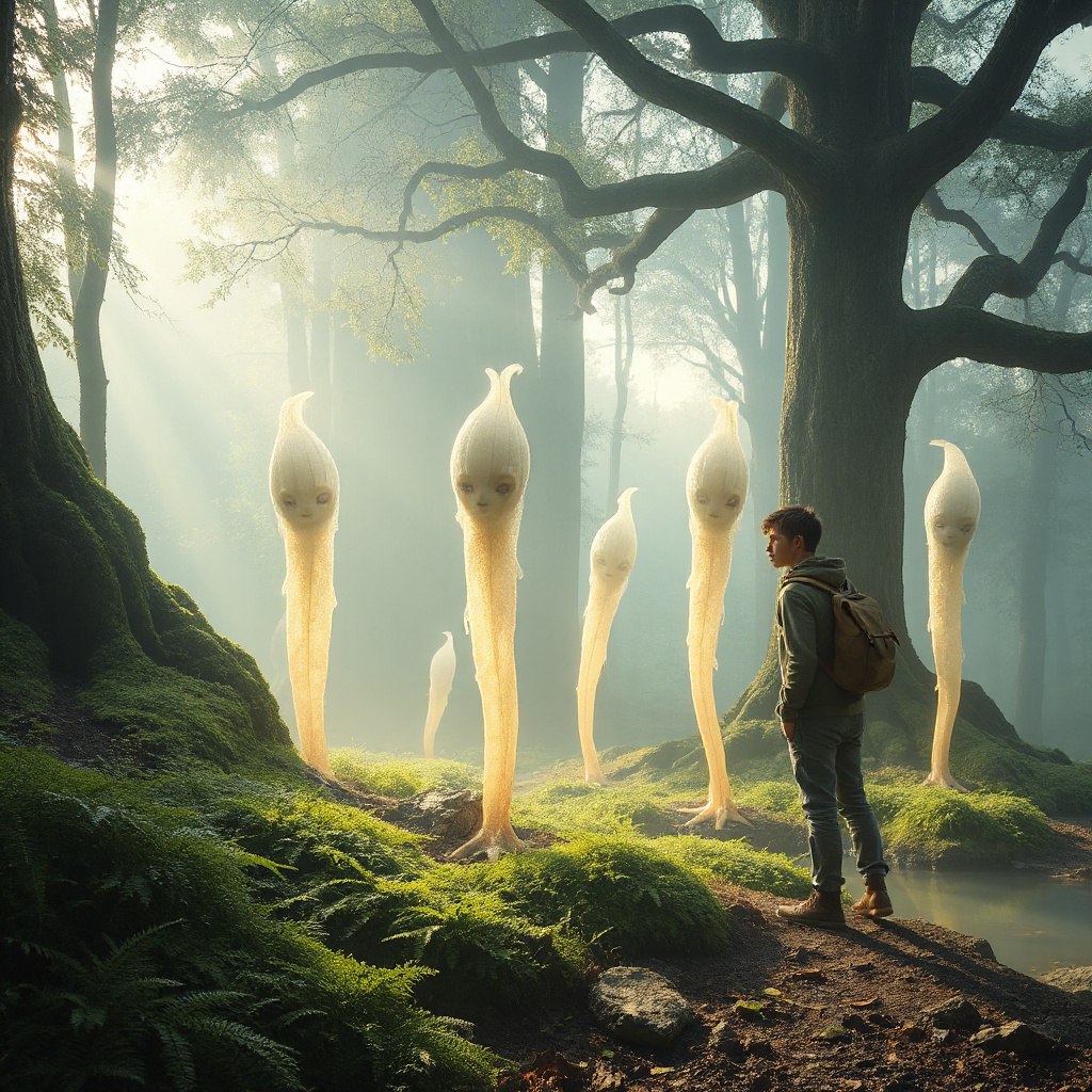 Из почвы начали подниматься фигуры — сначала смутные, туманные, потом всё более чёткие. Напоминали одновременно и растения, и людей: тела были полупрозрачны, внутри мерцали тонкие зеленоватые прожилки, как у молодых стеблей. Внешность спокойна, умиротворённа, будто знали ответы на вопросы, которых Миша ещё не успел задать.