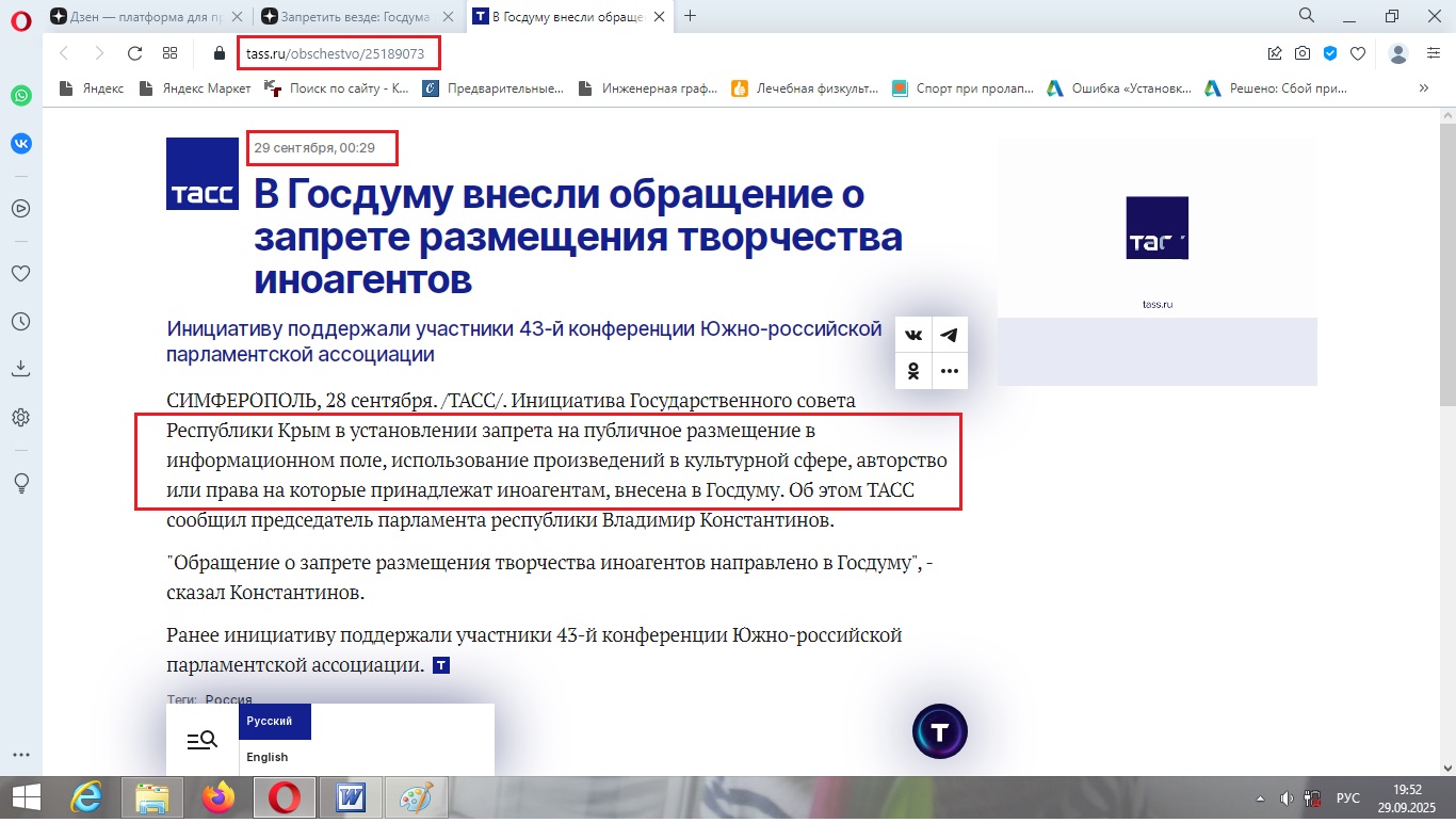 "В России могут запретить публичное использование всего, что создано с участием иноагентов, сообщает ТАСС. Пакет соответствующих предложений уже был направлен в Госдуму и внесен на рассмотрение, рассказал председатель парламента Крыма Владимир Константинов" (https://dzen.ru/a/aNmHhaNCZnqRR7Ts).