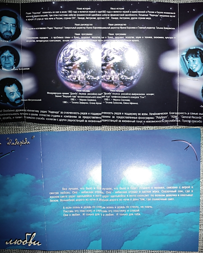 Спасибо всем, кто помог нам в подготовке к выходу в свет этого альбома! Особенно дружному коллективу радио "Надежда" за сплочённость рядов и поддержку во всём. Нечеловеческая благодарность и самые пылкие чувства Леониду Ландо, Александру Данилкину, Александру Егорову, Виктору Зерзеле и корпорации "Райс-Лис'с". Глубочайшая признательность лучшим в нашем отечестве студиям и компаниям за предоставленные фонограммы: "PolyGram", "RDM", "General Records", Студия "Союз", "D. L. Lota", "Zеко Records", "Gala Records".