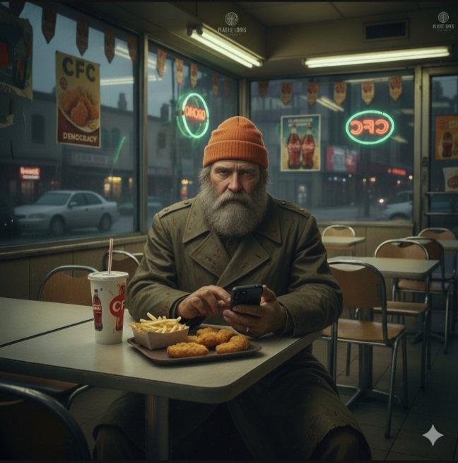 Он заказал самое безобидное — картошку фри, бледные, вялые соломинки-нади, по которым когда-то, быть может, пытался течь сок жизни, но ныне это были лишь каналы, ведущие в никуда. И наггетсы — бесформенные, золотисто-коричневые скандхи переработанной плоти, лишённые даже памяти о том, что у них когда-то были крылья, ноги, голос. Запивал всё это Большой Газировкой — сладкой, шипучей сансарой, чьи пузырьки лопались на языке, как миры в кальпе, оставляя после себя лишь привкус химической вечности и углекислого небытия. И наблюдал.