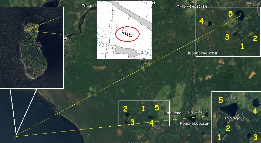 Самое интересное, что подходят все три группы озёр, кроме пожалуй группы у Нигижмы, эти озёра расположены уже за рекой Чёрная. Группа озёр у реки Водла имеет озеро Панезеро с большим островом, подходящим под схему. Но, всё таки в этой группе больше пяти озёр и большой разброс по размерам, в отличие от схемы "лебедей". Ближайшая к острову группа озёр, в прямоугольнике на фото, в районе Каршево, имеет в целом похожие размеры, где одно из пяти озёр меньше, но имеет большую, заболоченную пойму. Самое крупное озеро Пелтозеро имеет большой мыс, то есть подходит под схему первого "лебедя". К тому же расстояние по прямой, от острова до берега и от берега до центра группы озёр примерно одинаково, что может быть дополнительным ориентиром.