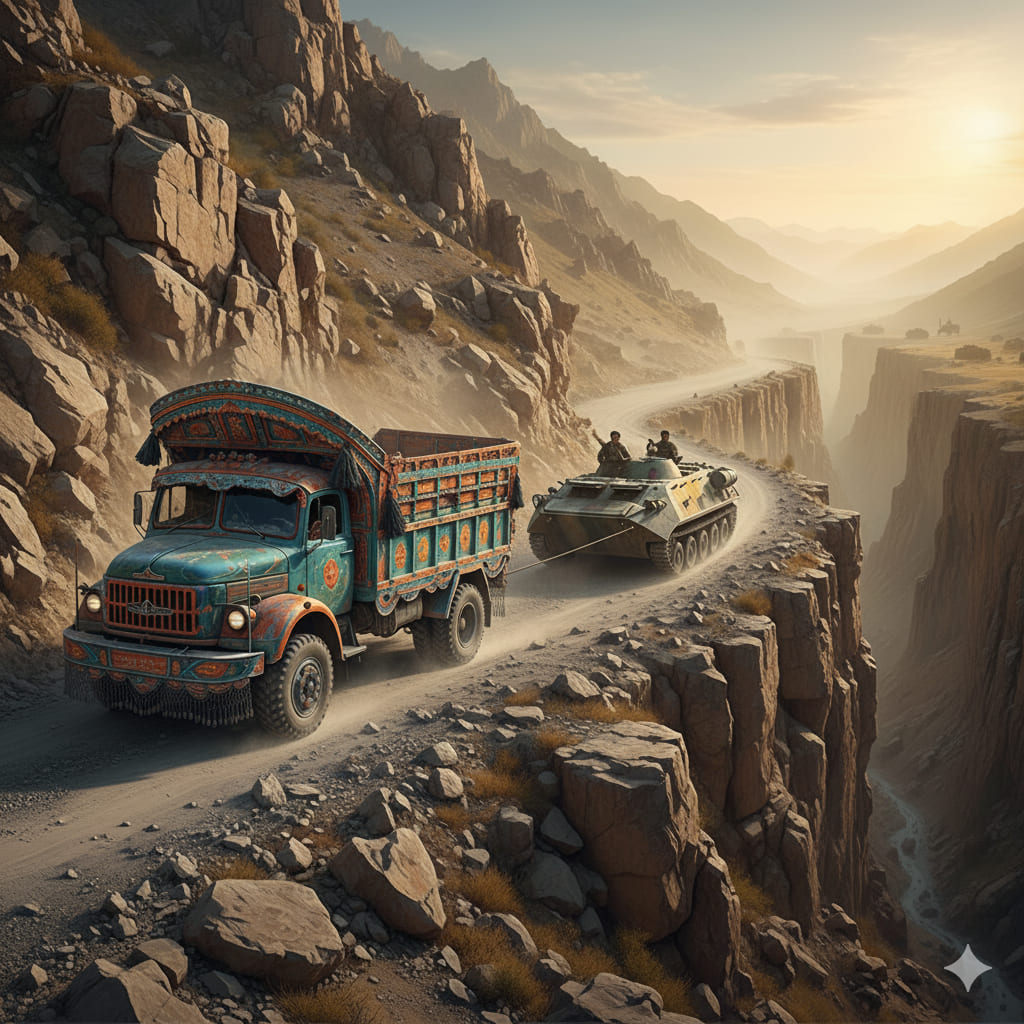 Вдруг из-за поворота со стороны озера вынырнула ярко разукрашенная словно новогодняя ёлка разноцветная фура. Увидев застывший на дороге советский бронетранспортер, водитель-афганец отнюдь не убавил, а напротив заметно прибавил скорость.