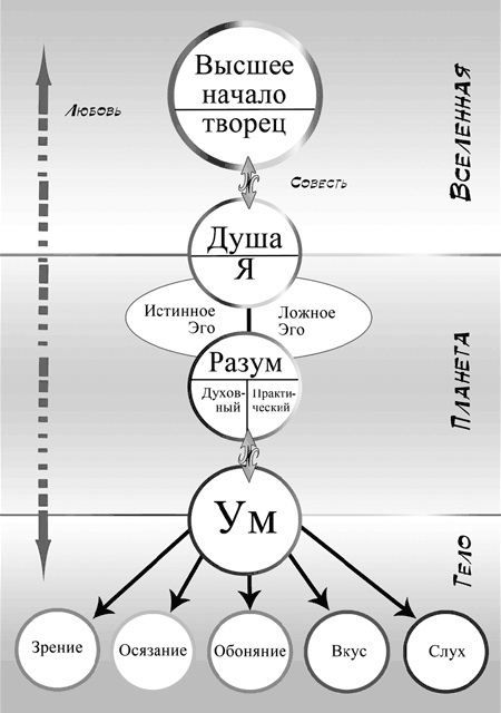 Ещё можно сравнить тело с автомобилем – такси, ведь Ум, это простой шофёр и возит какого-то важного пассажира, который способен заплатить за долгую поездку в течение жизни. Кто же этот пассажир? Религии говорят только одно имя – Душа! Она не вмешивается в управление тела – автомобиля: - Пусть мужчина этим занимается, - думает она, - я буду выражать свои чувства через биоробота. Буду писать картины, стихи, рассказы о том, что я вижу и переживаю, находясь в этом теле-автомобиле, посещая интересные страны, города и моря этого материального мира. Дело в том, что Душа заказала тело-автомобиль, находясь совершенно в другом мире Света, где не нужны эти отсталые механизмы по передвижению – тела автомобили + биороботы. Ведь другого способа нет, чтобы посетить и узнать этот странный материальный мир, как говорится «на своей шкуре».