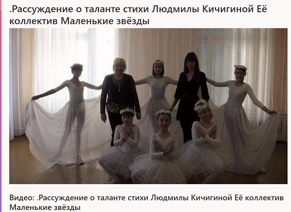 ТЕАТР ПЛАСТИКИ И ТАНЦА" МАЛЕНЬКИЕ ЗВЁЗДЫ "ДОМ ДЕТСКОГО ТВОРЧЕСТВА Г ОМСК руководитель КИЧИГИНА Л Т концертмейстер ЕРМОЛИН П .С.Людмила Кичигина -Неоднократный номинант национальной премии "Поэт года"2015-16-17-18гг, Номинант литературной премии Российского Императорского дома "Наследие"2015-16-17-18гг,