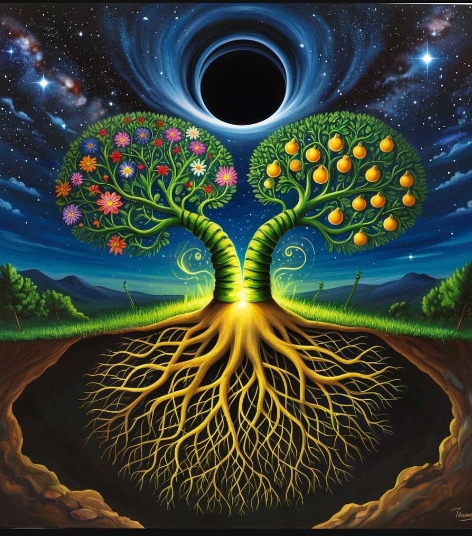 получилось вот такое сюрреалистичное изображение: оптимизм и оптимизация вырастают из одного корнеплода, а над ними нависает загадочная черная дыра, придающая картине особую атмосферу таинственности и глубины.