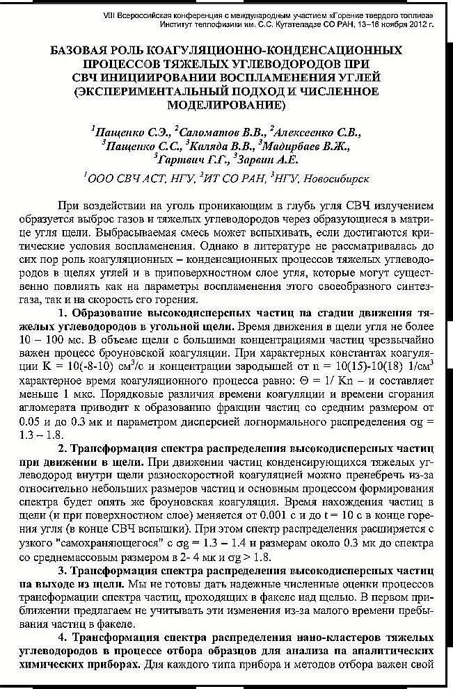 Авторы рассматривают явление выброса тяжелых углеводородов и газов из угля при проникновении внутрь него СВЧ-излучения. Они подчеркивают важность коагуляционных и конденсационных процессов, которые могут влиять на свойства получаемого газа и динамику воспламенения. В частности, ими рассмотрены: