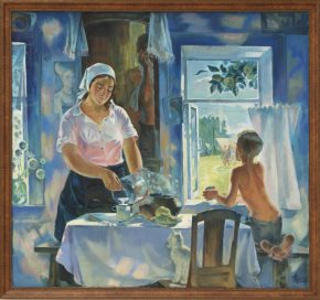 Голубое утро, так назвал я свою первую и большую картину, которую написал после завершения академии художеств в Петербурге и которую посвятил своей маме, своему светлому детству. В моей памяти детство осталось в такой яркой и тёплой картине. Можно ли описать словами эмоции и всплески душевных переживаний, когда создаёшь картину? Вряд ли. У картины есть свои, особые струны воздействия на человека, как и у музыки или поэзии. Если они есть в сути картины, то можно считать, что она родилась не зря.