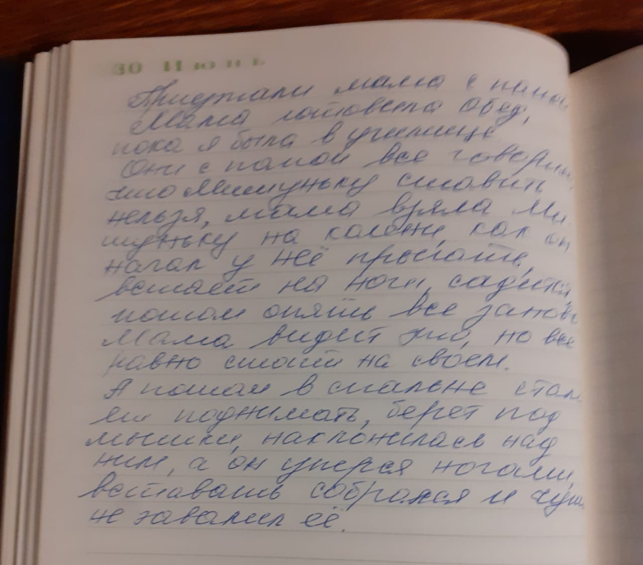 А потом в спальне стала его поднимать, берёт под мышки, наклонилась над ним, а он упёрся ногами, вставать собирался и чуть не завалил её.