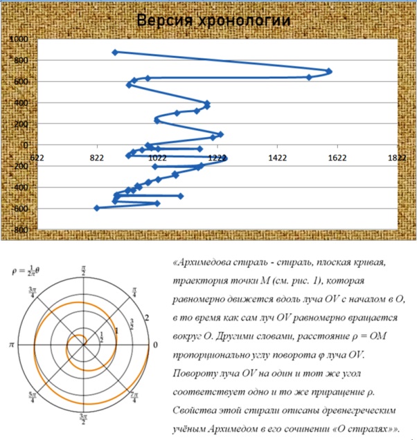 В рамках своей версии я вернул даты жизни некоторых исторических личностей в своё время. До нашего времени дошла информация о прошлом не ранее 622 года нашей эры. Поэтому начало шкалы времени по горизонтали я поместил в 622 год. А по вертикали отражена информация согласно истории. Получился график, напоминающий спираль, что подтверждает мою версию. Конечно, это ещё начало пути для возвращения прошлого. Но люди имеют право знать прошлое, а не написанную для них пародию в виде истории.