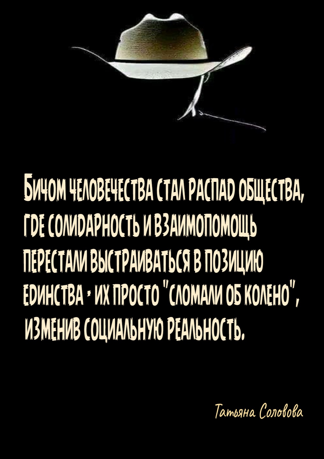Бичом человечества стал распад общества,где солидарность и взаимопомощь перестали выстраиваться в позицию единства-их просто "сломали об колено",изменив социальную реальность.