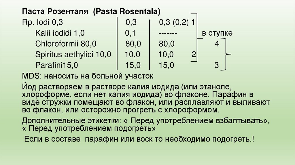 Через час мне торжественно вручили ёмкость внушительных размеров с надписью: «Линимент Розенталя». Внутри — смесь йода, хлороформа, спирта и парафина, в строго выверенной пропорции. Перед вручением — краткая устная инструкция: разогреть, подержав ёмкость в горячей воде, и наносить на область боли сеточкой или точками.