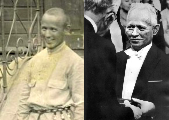 На склейке фото Михаил Шолохов во дворе Миллеровского ОГПУ (11 сентября 1928) и при вручении Нобелевской премии по литературе (10 декабря 1965, Стокгольм)