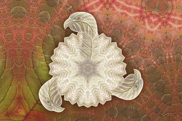 Щит нарисован Байкальскими осенними листьями в фотошопе. Это сложный фотомонтаж, которому нет аналогов в мире. Из фондов Избушки Волшебных Традиций на Байкале в Листвянке.