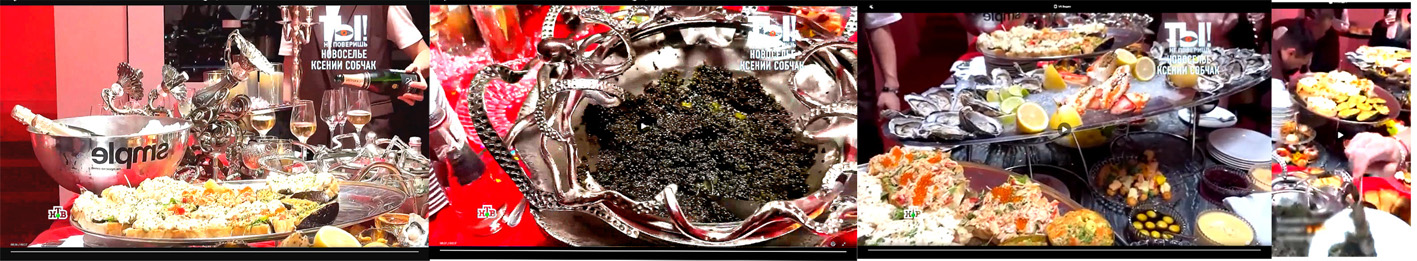 В Москве вечеринка в стиле нулевых, в атмосфере гламура и беззаботности начала 2000-х. с роскошным ужином с обилием морских деликатесов и дорогого шампанского, со столом, украшенным блестками, с черной икрой, поданной в огромной чаше, лобстерами, морскими ежами и прочими изысками, было и французское шампанское по 15 000 рублей за бутылку