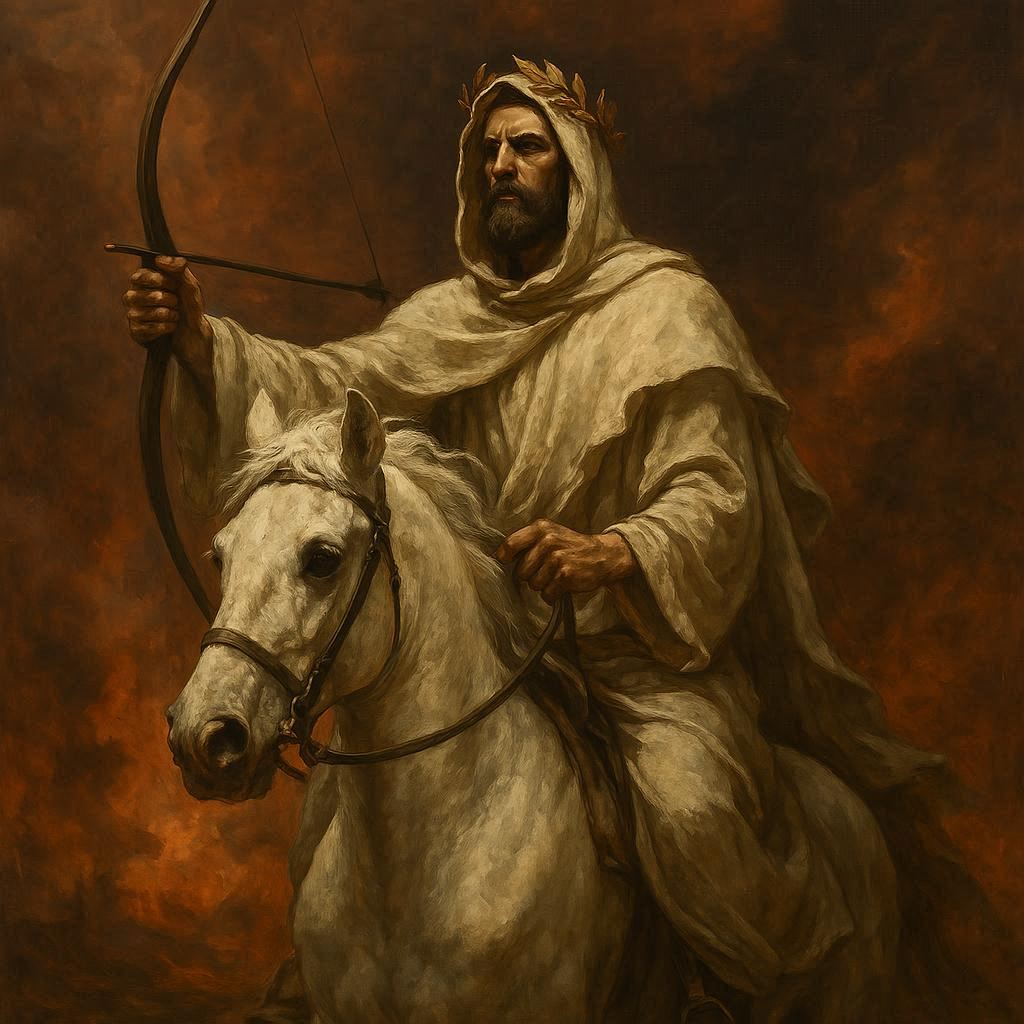 Базовый символизм образа, изложенный в Откровении (6:2), двойственен: белый конь — цвет чистоты и победы, лук в руках — оружие дальнего боя, символизирующее силу и агрессию, венец — атрибут власти и царственности. Именно эта двойственность позволяет рассматривать Всадника не как однозначное добро, а как гибридный образ. Он использует атрибуты святости (белизна, венец) для целей, по своей сути являющихся завоевательными и насильственными (лук, «победа чтобы победить»). Это идеальная метафора для *ложного эго* — психологической конструкции, которая маскирует личные амбиции, жажду власти и проект тотального контроля под видом миссии, божественного права или высшей истины.