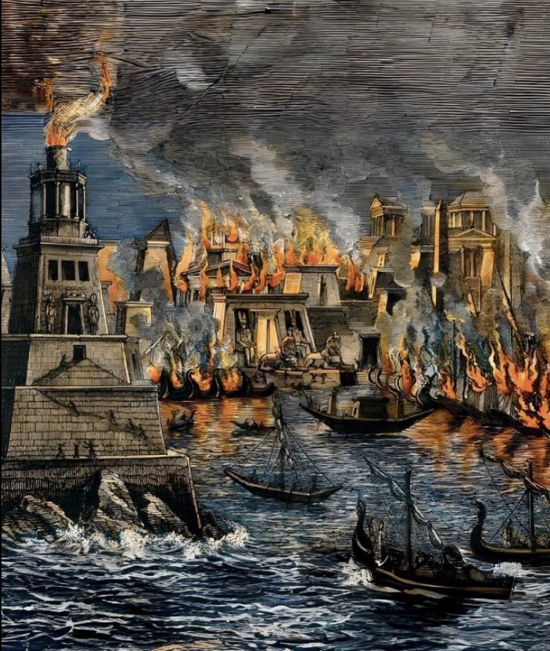 Мы действительно не знаем. Некоторые говорят, что люди Цезаря разрушили ее случайно во время гражданской войны в 48 г. до н.э., или это сделал Диоклетиан, когда разграбил город в 298 г. н.э.