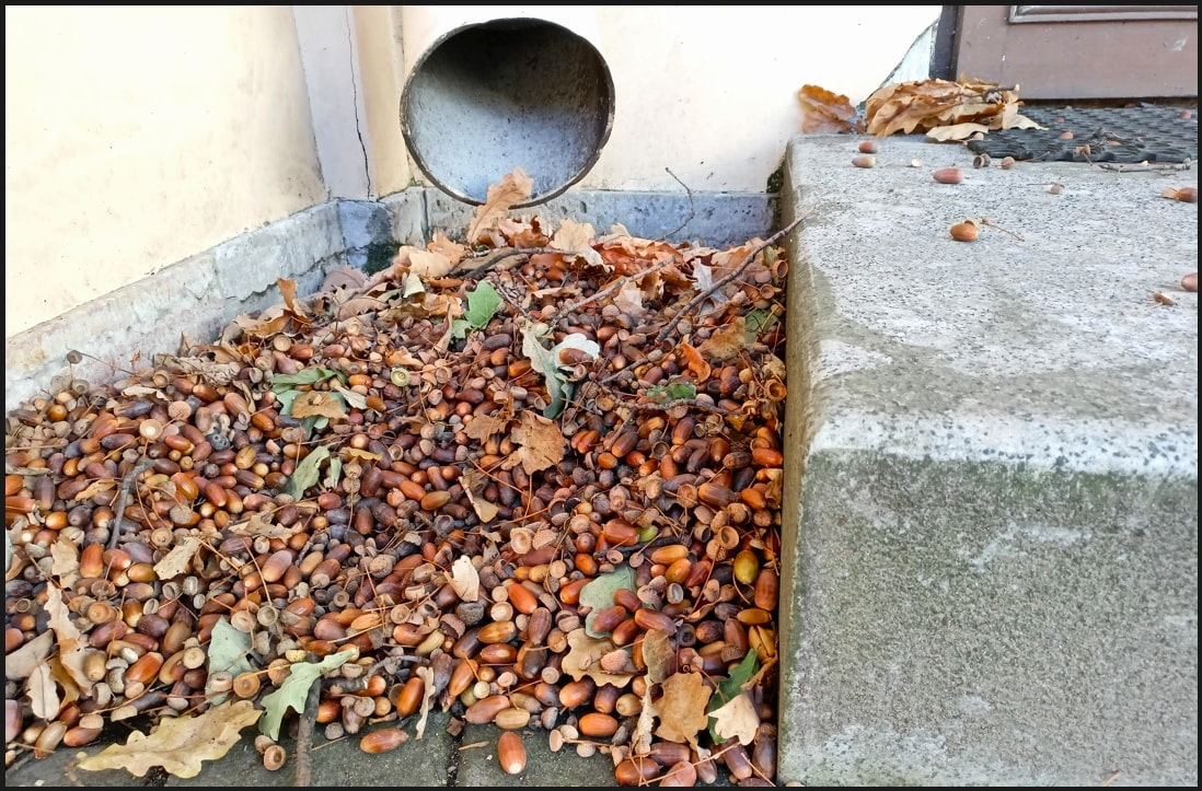 При каждом порыве ветра на жесть крыши флигеля обрушивается… (отчетливо слышна барабанная дробь) целый желудевый град. И, как и предусмотрено, для осадков, выпавших на крышу, они скользят по ее скатам, улавливаются водосборным желобом и скатываются в водосточную трубу.