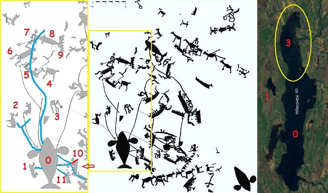 Таким образом, этот район озера Канозеро и верховья реки Кана, полностью совпадают с условными обозначениями петроглифов. Однозначно можно сказать, что для подобного рисунка на скале нужна ориентация по сторонам света, приёмы топографической съёмки местности. Сами рисунки не ориентированы по компасу с характерными местами. Петроглифы нарисованы, как будь то это результат похода в верховья "по памяти".