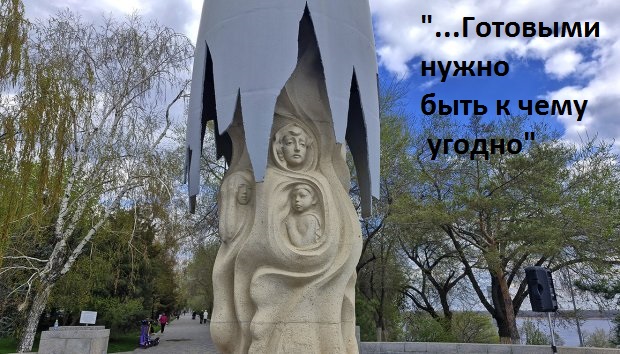 Мне часто случается проезжать мимо памятника жертвам бомбардировки Сталинграда силами фашистского Евросоюза, когда в один воскресный день погибло по разным оценкам до пятидесяти тысяч мирных жителей. На фоне смс латинизированных охранителей, которые несомненно станут артефактами этого смутного времени, как стали им таблички «Эта сторона улицы наиболее опасна при артобстреле» из блокадного Ленинграда, он смотрится зловещим пророчеством. И самое страшное, что «…готовыми нужно быть к чему угодно". Еще страшнее, что произносится это в самозабвенном токовании безбрежного дарвалдайства.