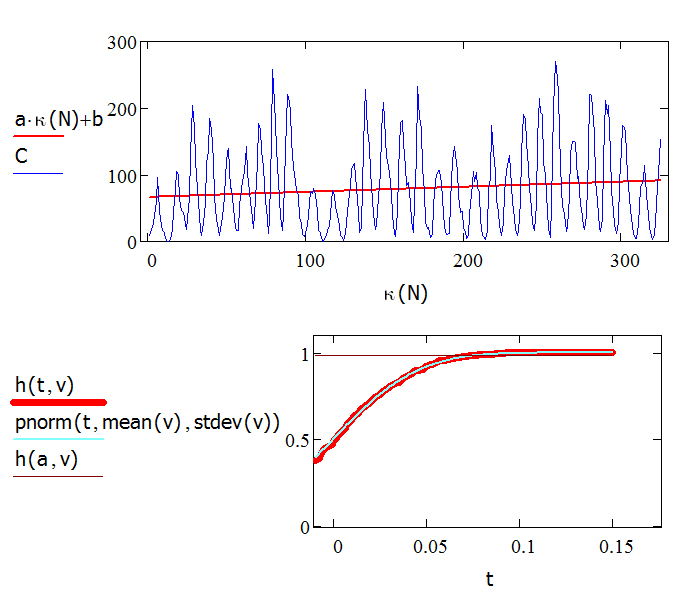 Что означает именно такая прямая, мы выясним по методу Монте-Карло. Сначала строим 1000 случайных величин, распределённых так же, как C; находим для каждой из них свой slope, — получаем вектор v, находим эмпирическую функцию распределения h(t, v) вектора v. Видим, что это — нормальное распределение pnorm(t, mean(v), stdev(v)). Теперь оцениваем параметр a относительно этого распределения. Получаем следующую картину: