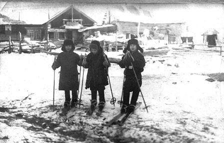 Наш папа часто уезжал в командировки, мама работала, свободное от школы время мальчишки проводили по своему усмотрению. Бегали по посёлку, играли с друзьями либо в войнушку у себя во дворе, катались на лыжах и коньках. Втроём им было весело. На фото Толик, Лёня и их друг катаются на лыжаху нас в огороде. Сзади слева — клуб.
