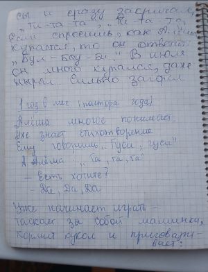 Милые добрые подробности...К 11 месяцам прорезалось 6 зубов. Первое слово - мама, папа сказал - в 9,5 месяцев. Листаю тетрадь...А вот рассуждения уже в 3 года: "Оля, вон сколько мух размножилось и комаров! Мама, а давай ты будешь мой сыночек?"