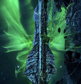 Её лицо наполовину в тени, прямо как инь-янь, на голове, от бровей, клобуком, высоким, как ведро, тяжёлая корона. В короне, чуть выше лба, третий глаз, пронзительный и голубой. В левой руке царевны-круглая, рельефная чаша, чёрного камня, с округлыми крупными впадинами, покрывающими её всю. На краю выточена ручка, довольно примитивная, палеотическая русалка, с рыбьим хвостом… на чаше зелёные отблески…Из неё-в-неё, зелёный, дымный, состоящий их зелёного света с длинными рогами прозрачный-призрачный дракон…